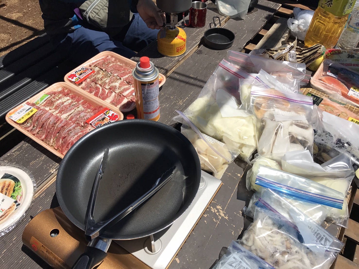 持参したガスコンロやフライパンを出し、仕込んでいただいた野菜や肉をどんどん投入。